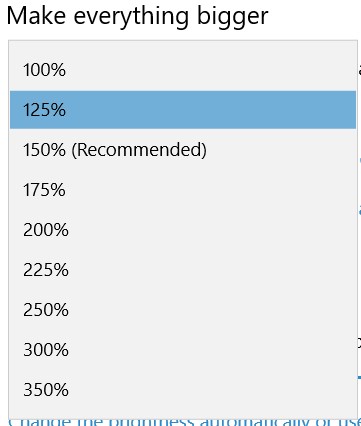 - Step 3. Changing this value will make everything look bigger or smaller. If you want everything to appear smaller so you can see more of the screen, choose 100%. If find text hard to read and you want to make everything look bigger, choose 125% or 150% (or higher if text is still hard to read).